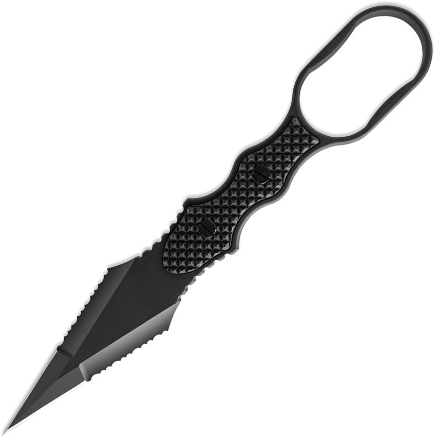 10" (25.4cm) overall. 4" (10.16cm) black PVD coated double edge D2 tool steel dagger blade. Black textured G10 handle. Full, extended tang. Finger ring. Partially serrated blade. Black Kydex belt sheath. Boxed.