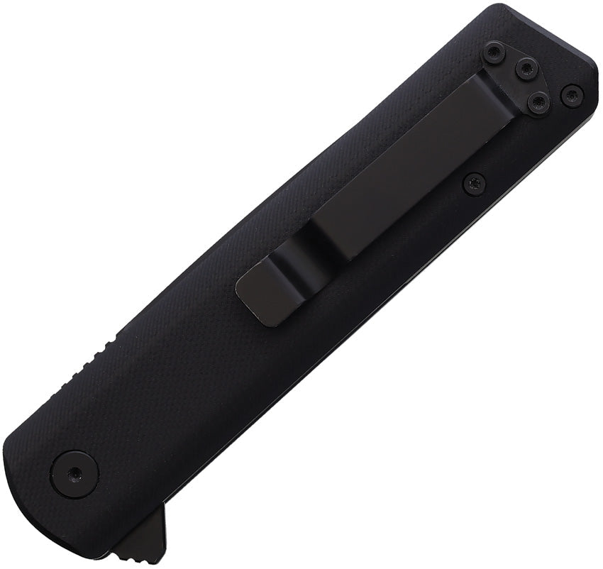 4.5" (11.43cm) closed. 3.5" (8.89cm) black finish D2 tool steel drop point blade. Black G10 handle. Extended tang. Pocket clip. Black nylon zippered storage case. Boxed.