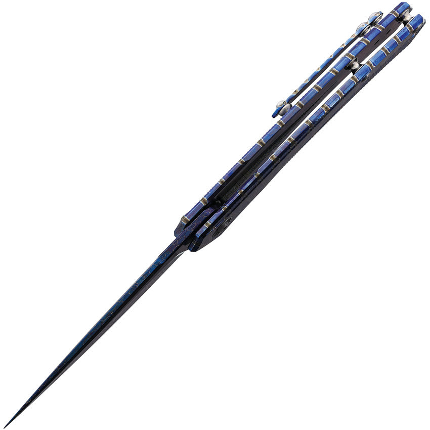 4,75" (12,07 cm) chiuso. Lama in acciaio Damasco da 3,75" (9,53 cm). Manico in titanio anodizzato blu con inserto in timasco. Codolo esteso. Foro per cordino. Fermaglio da tasca. Custodia rigida per il trasporto.