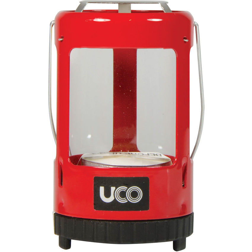 Dimensions: 4" x 2.25". Red powder-coated finish aluminum body. Comes with four tealight candles (each with 3-4 hour burn time). Carry handle, hanging hook, heat shield. Twist-lock, vented base to make changing candles easily. Includes carry case. Boxed with hanging tab.