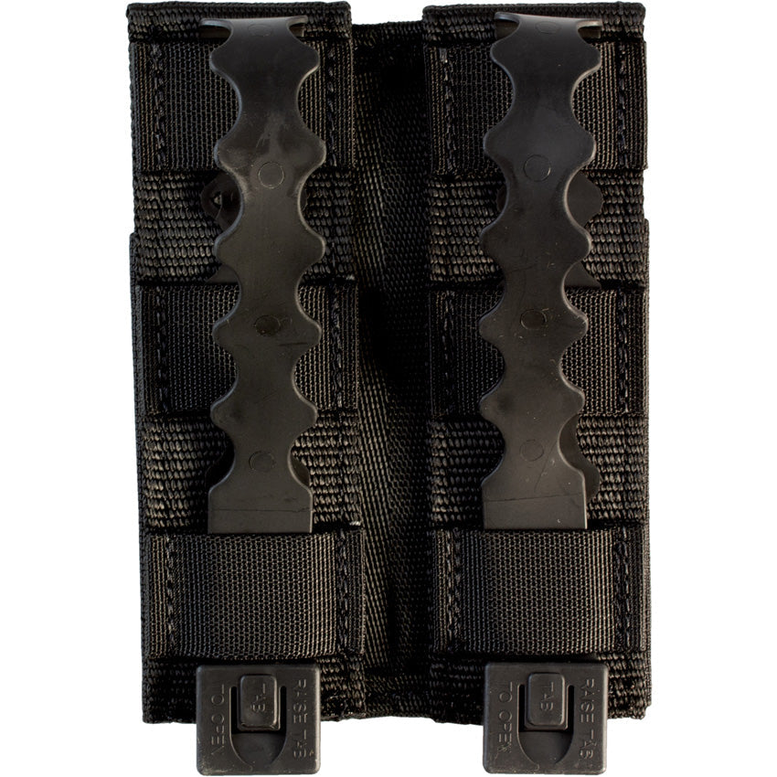 Extra wide 4" elastic webbing. Low profile and lightweight design. Four secure compartments for carrying single or double stack pistol magazines or other small equipment. Affixes to MOLLE or belt with included 6" MALICE clip. Color: Black. Hang packaged.