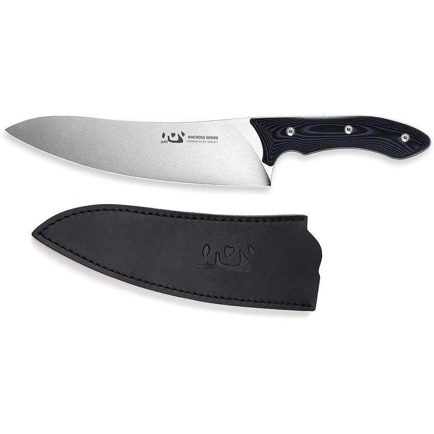14,25" (36,2 cm) complessivi. Lama da 8" (20,32 cm) con finitura stonewash. Manico in G10 nero e blu. Codolo pieno. Lama in acciaio speciale legato a polvere. Fodero in pelle nera. In scatola.