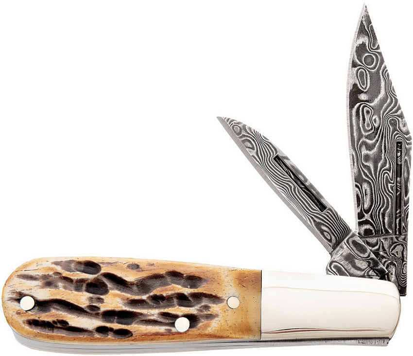 3" (7.62cm) closed. Damascus steel clip and pen blades. India stag bone handle. Nickel silver bolster(s). Boxed.