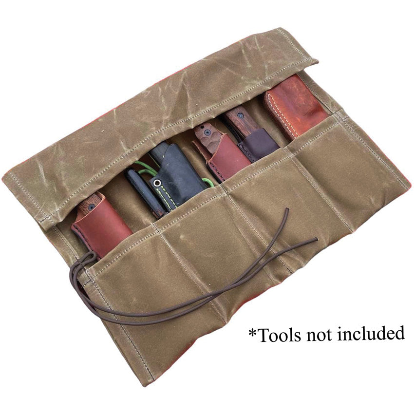 Dimensions: 18" x 17". Waxed canvas construction. Four 4" x 5.5" pockets. Can carry knives up to 15" with 2" of flap protection coverage still available. Bulk packed.