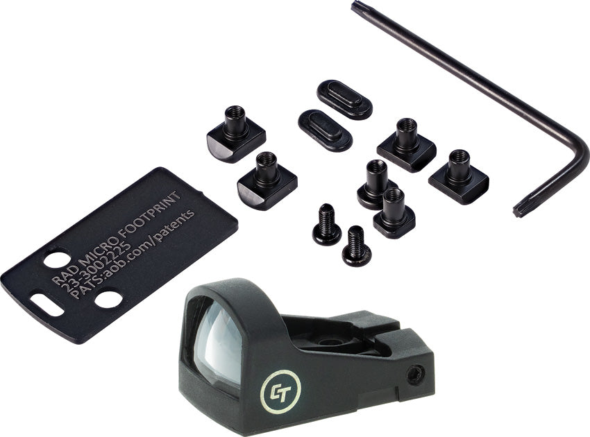 Waterproof. Shockproof. Limited edition. Lets you mount a best-in-class red dot on a Smith & Wesson or GLOCK pistol. This kit uses the existing dovetail notch to secure the low profile adapter plate to the slide. 5 MOA red dot. CT Radiant sensor. Tempered glass lens. Rear sight notch. Bottom access battery. Mounting screws. Aluminum adapter plate. Dovetail side bolts. Fits: GLOCK (all full size; 42; 43; 48); Smith & Wesson. (M&P; M&P 2.0; Full size; Compact; Shield; Shield Plus; Shield EZ). Polymer construction. Color: Black. Boxed with hanging tab.