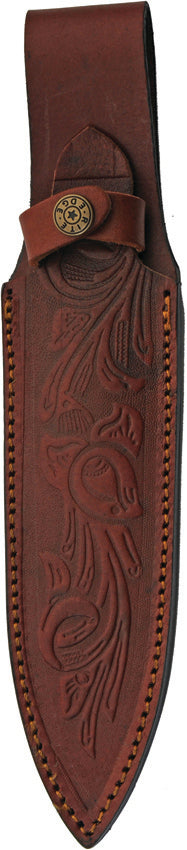 12" (30.48cm) overall. 7.5" (19.05cm) Damascus steel blade. Burnt bone handle. Copper bolster(s). Full tang. Turquoise spacers. Brown leather belt sheath. Boxed.