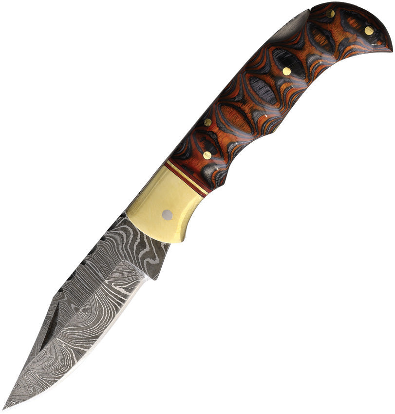 3.75" (9.53cm) closed. 3" (7.62cm) Damascus steel clip point blade. Black and brown sculpted wood handle. Brass bolster(s). Brown leather belt sheath. Boxed.