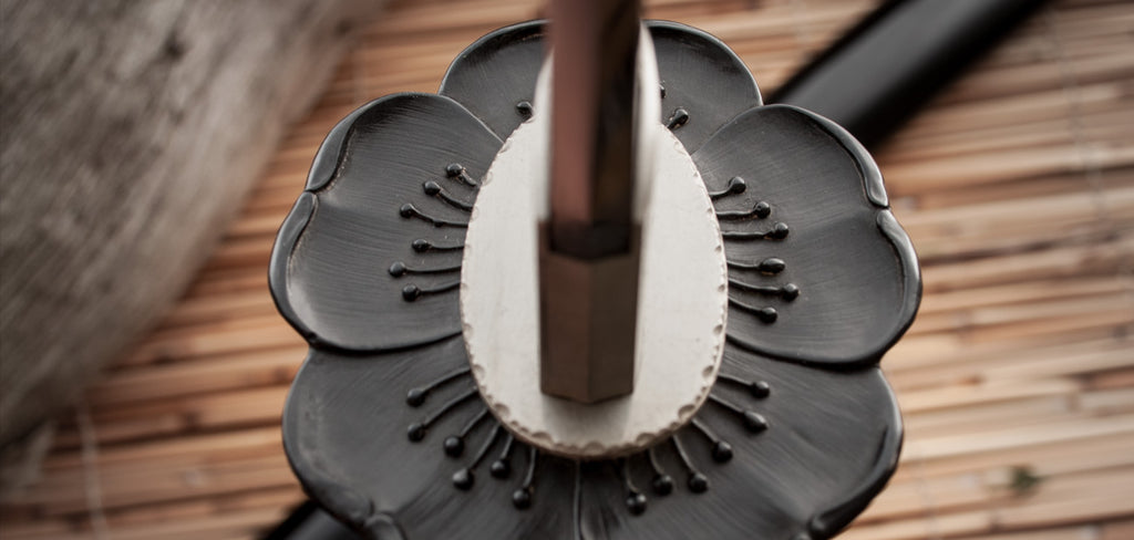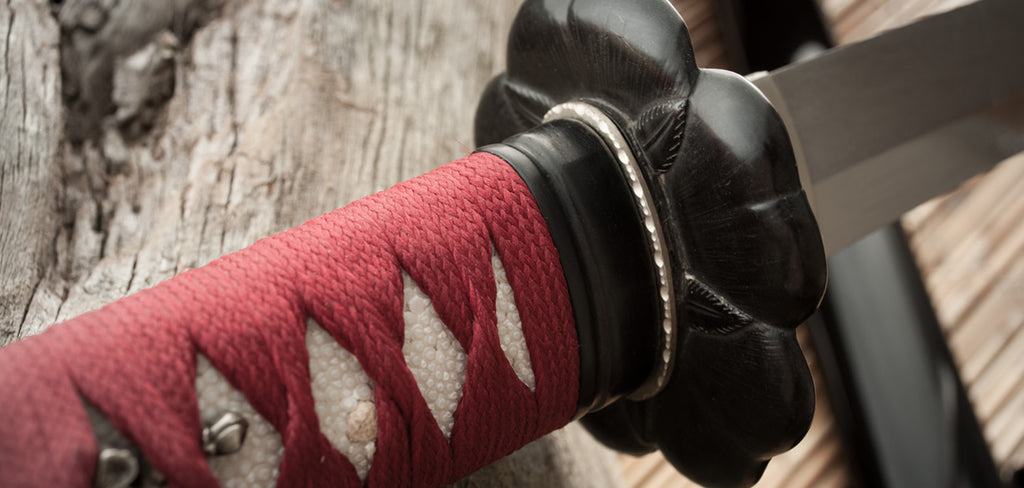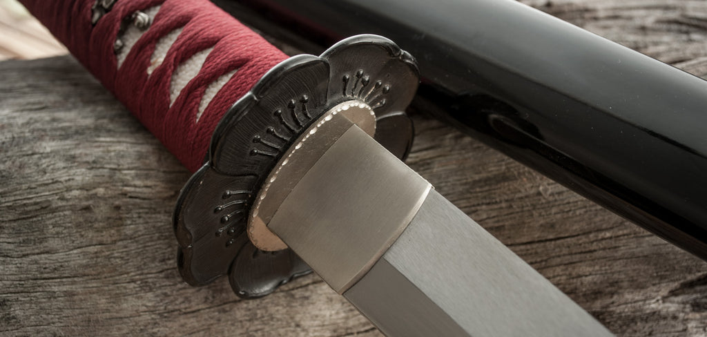 39 3/4" overall. 27" 5160 through-tempered high carbon forged steel blade. White Ray skin handle with crimson tsuka-ito handle wrap. Cherry blossom menuki handle ornaments. Black lacquered scabbard with buffalo horn scabbard mouth and wooden knob with black nylon sageo cord.