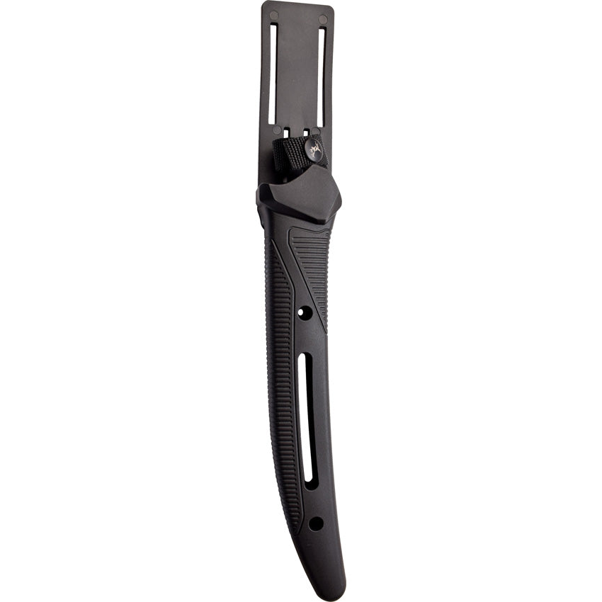 Orange synthetic handle with black rubber insert. Full tang. Lanyard hole. 5.25" handle. Comes with three interchangeable blades. Black plastic belt sheath. Boxed.