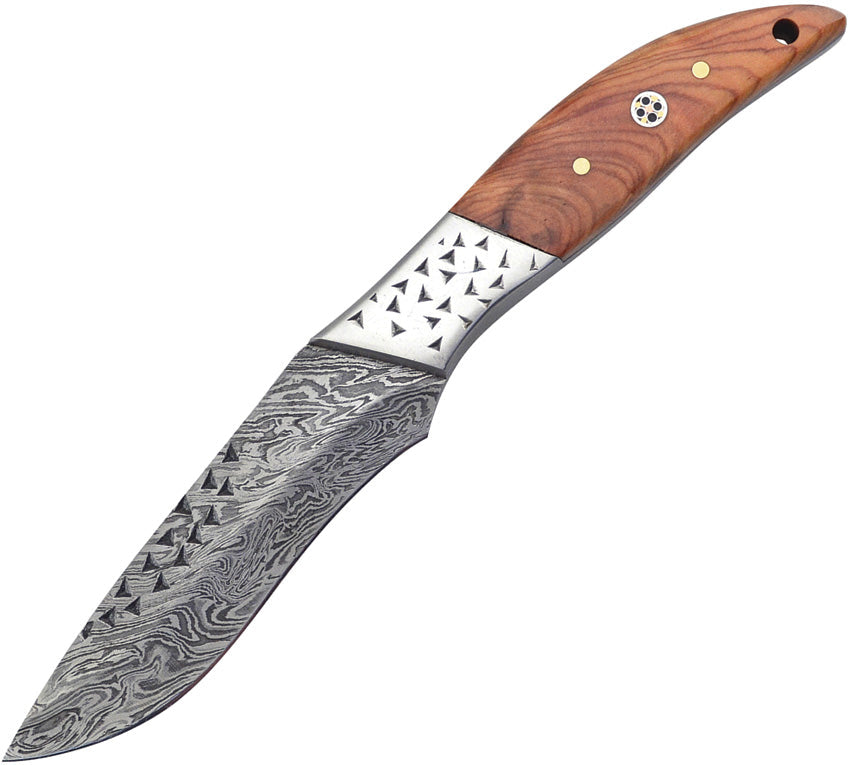 Valley Forge. 8" (20.32cm) overall. 3.75" (9.53cm) Damascus steel blade. Olive wood handle. Stainless bolster(s). Lanyard hole. Full tang. Brown leather belt sheath. Boxed.