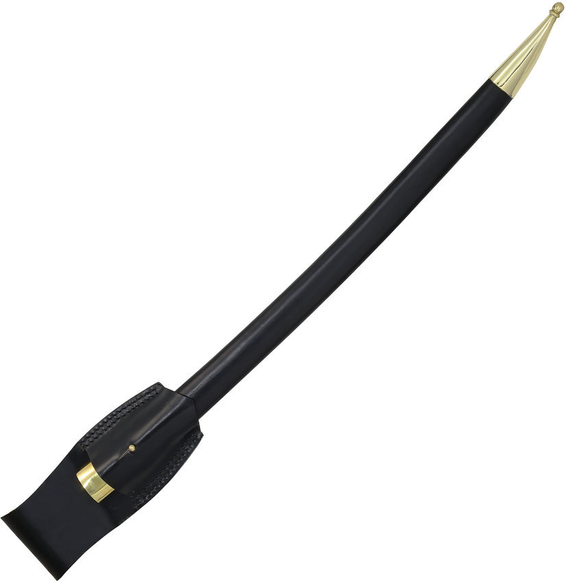 31" (78.74cm) overall. 24.5" (62.23cm) stainless blade. Wire wrapped black leather handle with brass D-guard. Black leather scabbard. Bulk packed.