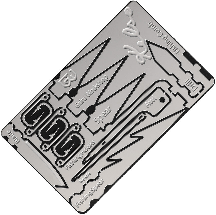 Dimensions: 3.38" x 2.13". Includes: (6) Fishing hook; Fishing Spear; Needle; Awl; Small drill tip; (3) Arrowhead; Fishing comb; Small blade. Tool retention system allows tools to be removed and put back. Non-magnetic and not sticky. Surgical grade stainless construction. Bulk packed.