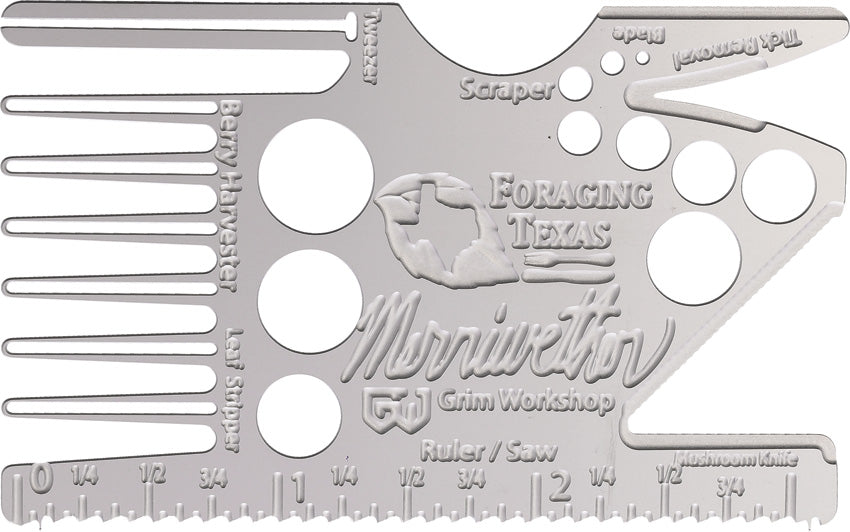 Dimensions: 3.38" x 2.13". Includes: Tweezers; Scraper; Blade; Tick remover; Mushroom knife; Ruler; Leaf stripper; Saw; Berry harvester. Designed by Dr. Mark "Merriwether" Vorderbruggen. Standard credit card size. Stainless construction. Bulk packed.