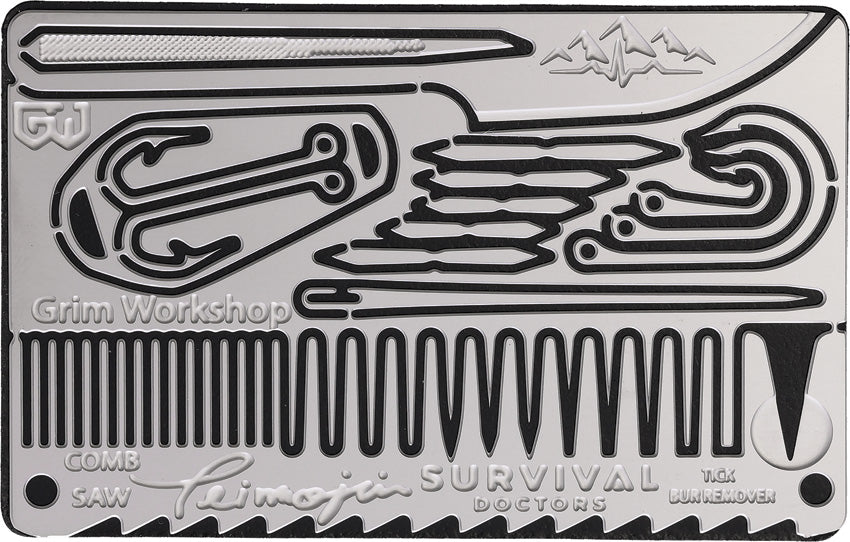Dimensions: 3.5" x 2". Includes: Saw; Comb; Tick remover; Easy thread sewing needle; Fishing lure; Fishing hooks; Gorge hooks; Small knife; Small awl. Credit card size. Stainless construction. Bulk packed.