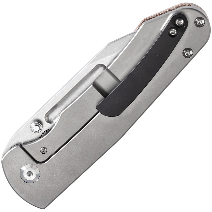 5.13" (13.03cm) closed. 3.88" (9.86cm) stonewash finish CPM S35VN stainless blade. Brown canvas micarta handle with titanium back handle. Extended tang. Thumb stud. Pocket clip. Black nylon zippered storage case. Boxed.