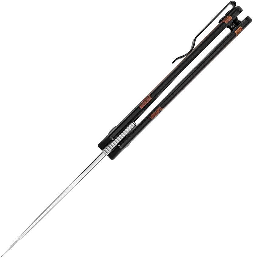 4.5" (11.43cm) closed. 3.38" (8.59cm) satin finish 154CM stainless blade. Black G10 handle with Mikuruti inlay. Extended tang. Thumb pull. Pocket clip. Boxed.