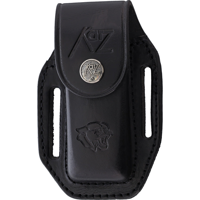 3.88" (9.86cm) closed. 2.88" (7.32cm) satin finish stainless drop point blade. Black Kraton handle. Stainless bolster(s). Thumb disk. Black leather belt sheath. Boxed.