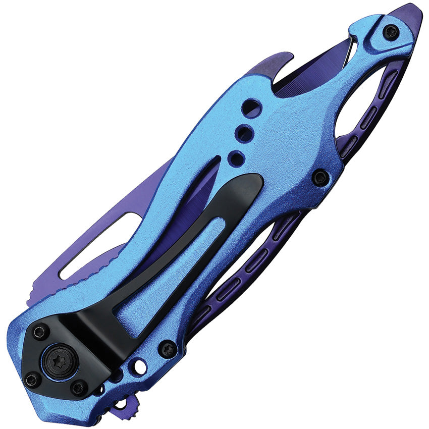 Assisted opening. 4.75" (12.07cm) closed. 3.5" (8.89cm) purple TiNi coated stainless blade. Blue aluminum handle. Bottle opener. Extended tang. Lanyard hole. Pocket clip. Thumb pull.