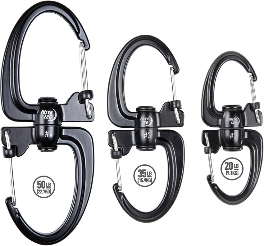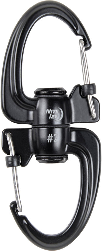 Dimensions: 1" x 2.6" x 0.4". Dual locking carabiner with swiveling center. Rotate either side for easy item access. Secure stainless steel wire gates with slide-to-lock feature. Gates can be locked independently. Size #2 weight rating: 20 lbs. Hang packaged.