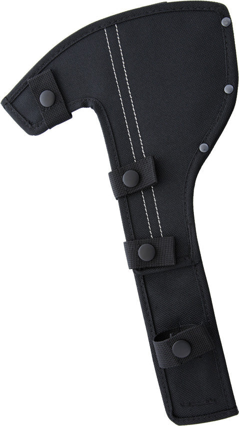 13" overall. 7" black powder coated 5160 carbon steel axe head with 5" cutting edge. Black grooved rubber handle. Lanyard hole. Cosmetic blemish factory second. Black nylon belt sheath. Bulk packed.