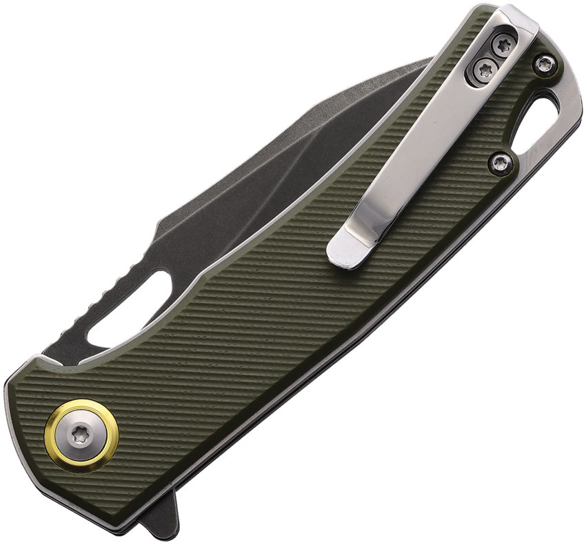 4.25" (10.8cm) closed. 3" (7.62cm) black stonewash finish stainless blade. Green micarta handle. Thumb pull. Extended tang. Lanyard hole. Pocket clip. Boxed.