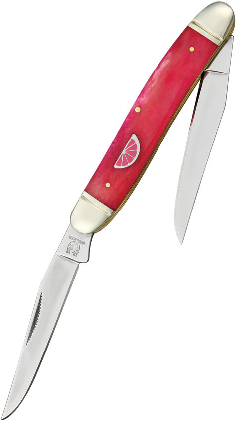 Pink Lemonade Series. 3 7/8" closed. 440 stainless twin clip blades. Pink smooth bone handles with grooved nickel silver bolsters and pink lemonade inlay shield.
