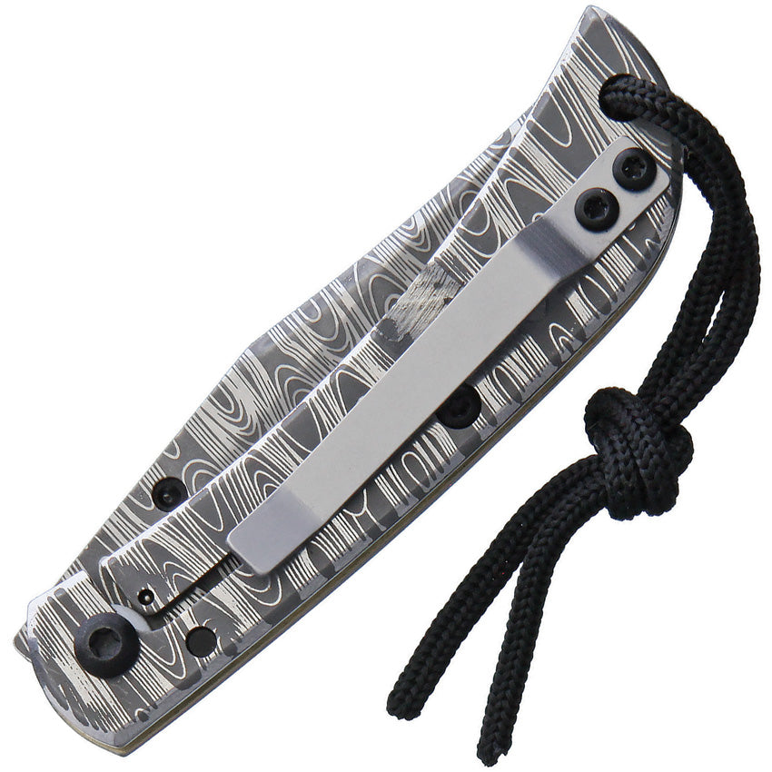 3" closed. 2.25" stainless clip point blade. Stainless handle. Thumb stud. Lanyard hole. Faux Damascus finish blade and handle. Boxed.