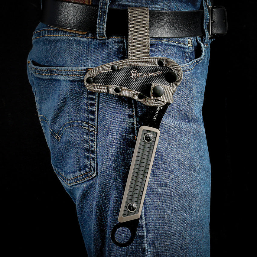 8.5" (21.59cm) overall. 3.5" (8.89cm) black powder coated 420 stainless blade. Black and tan TPR handle. Full, extended tang. Finger ring. Tan ballistic cloth MOLLE compatible belt sheath. Clam packed.