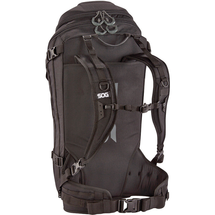 Dimensions: 26.4" x 11.6" x 9.4"; Construction: Kodra 500D Nylon; Color: Black; Weight: 58.6 oz; Carry Volume: 35 Liters; Kit Contents: stowable shoulder straps. Hypalon zinger tabs. Sternum strap with whistle. Quick adjust shoulder straps. Stowable padded hip belt. Rigid suspension system with aluminum staves. Internal organization pockets. Sunglass storage with loop lining. Long carry tie down. External compression flap with pocket. Built-in hydration storage. Internal laptop sleeve. MOLLE webbing and loop field. Panel load main compartment access. Key ring clip. Quick release daisy chain. Other Info: External loop field. Front grab handle. Shock cord tie downs. Laser cut Hypalon MOLLE field. Braided steel tool retention loops. Quick access front storage. Strap organizers. Webbing lashing points. Quad-zip main compartment access. Large zipper pulls. Side compression straps. Impact resistant shell. Top grab handle. Adjustable load stabilizers. Quick release Bulk Packed.
