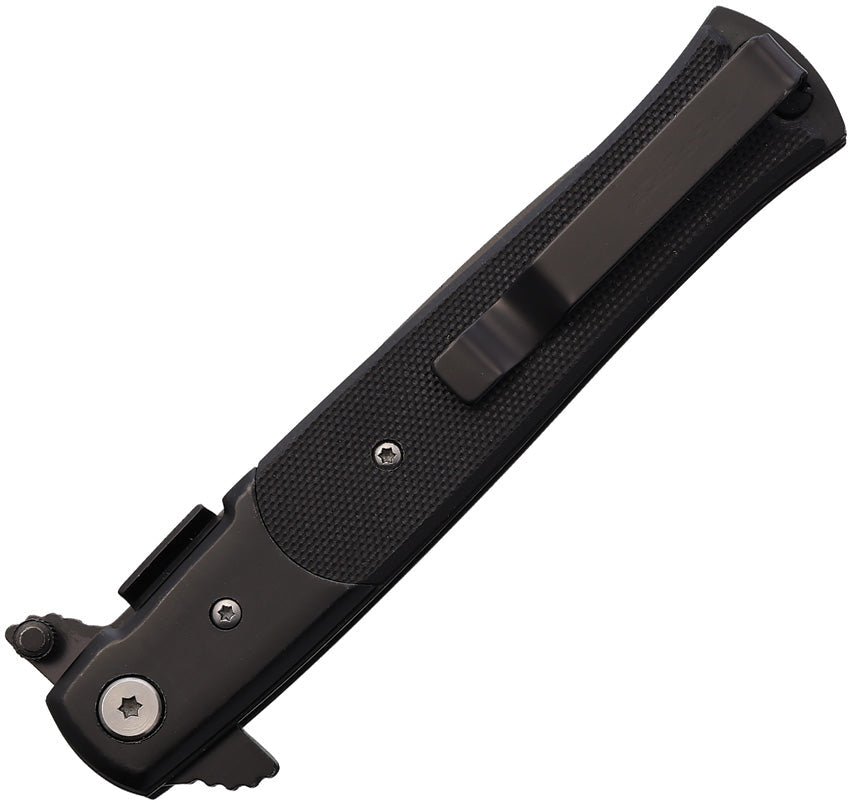 Assisted opening. 4.88" (12.4cm) closed. 3.75" (9.53cm) black finish stainless spear point blade. Black G10 handle. Stainless bolster(s). Extended tang. Thumb stud. Lanyard hole. Pocket clip. Boxed.