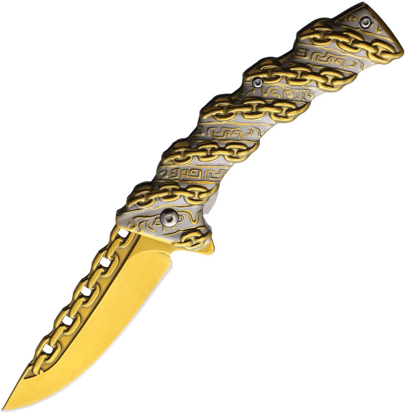 Assisted opening. 4.75" (12.07cm) closed. 3.5" (8.89cm) gold TiNi coated stainless blade. Gold and silver TiNi finish stainless handle. Extended tang. Pocket clip. Boxed.