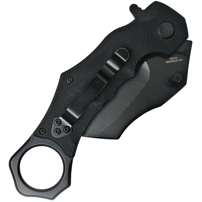 5.25" closed. 2.75" black finish stainless karambit blade. Black G10 handle. Finger ring. Thumb stud. Extended tang. Black nylon belt sheath. Boxed.