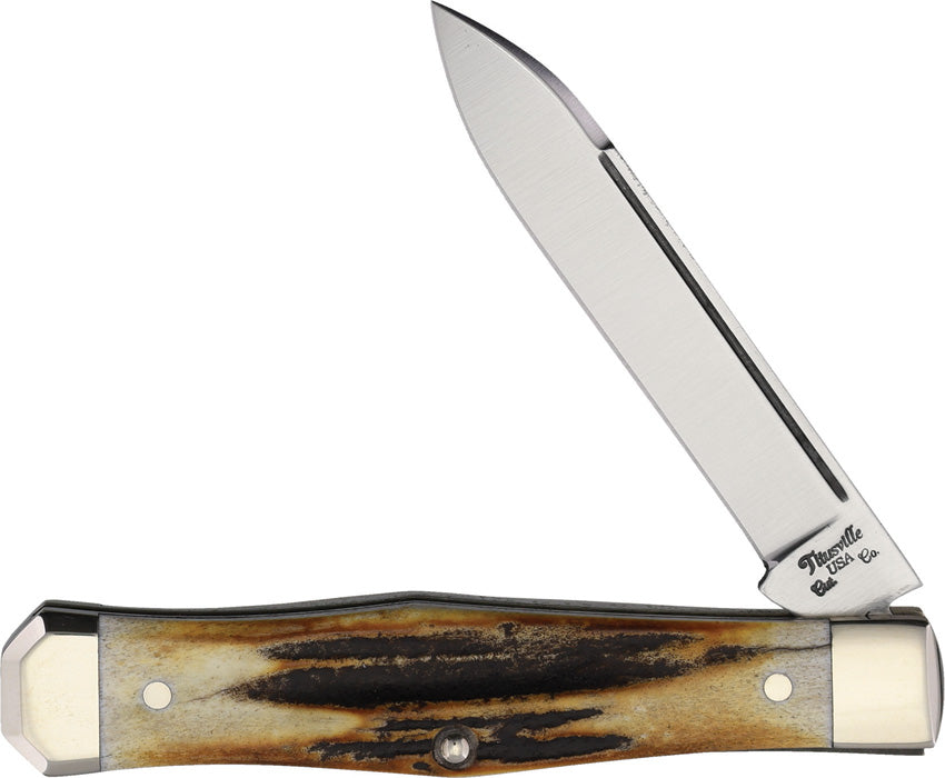 3.75" (9.53cm) closed. Satin finish 1095HC steel spear blade. Burnt stag handle. Nickel silver bolster(s). Comes in cardboard tube.