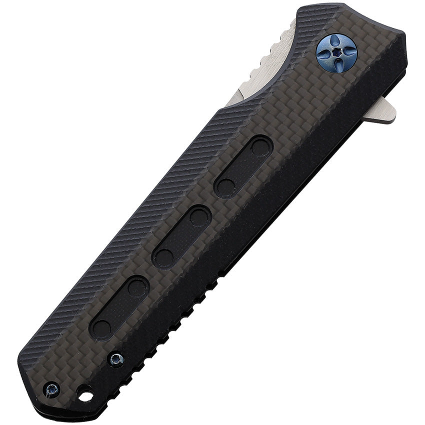 4.88" (12.4cm) closed. 3.5" (8.89cm) satin finish 7Cr17MoV stainless blade. Black G10 handle with carbon fiber inlay. Extended tang. Lanyard hole. Pocket clip. Boxed.