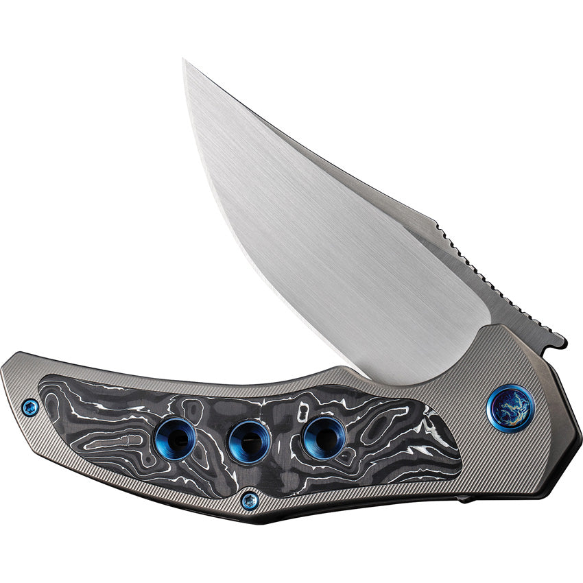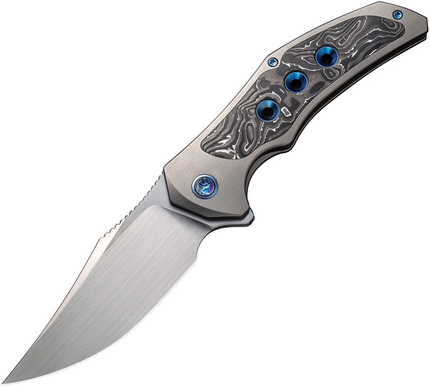 4.75" (12.07cm) closed. 3.75" (9.53cm) satin finish CPM-20CV stainless clip point blade. Gray titanium handle with Aluminum foil carbon fiber inlay. Extended tang. Pocket clip. Black nylon zippered storage case. Boxed.