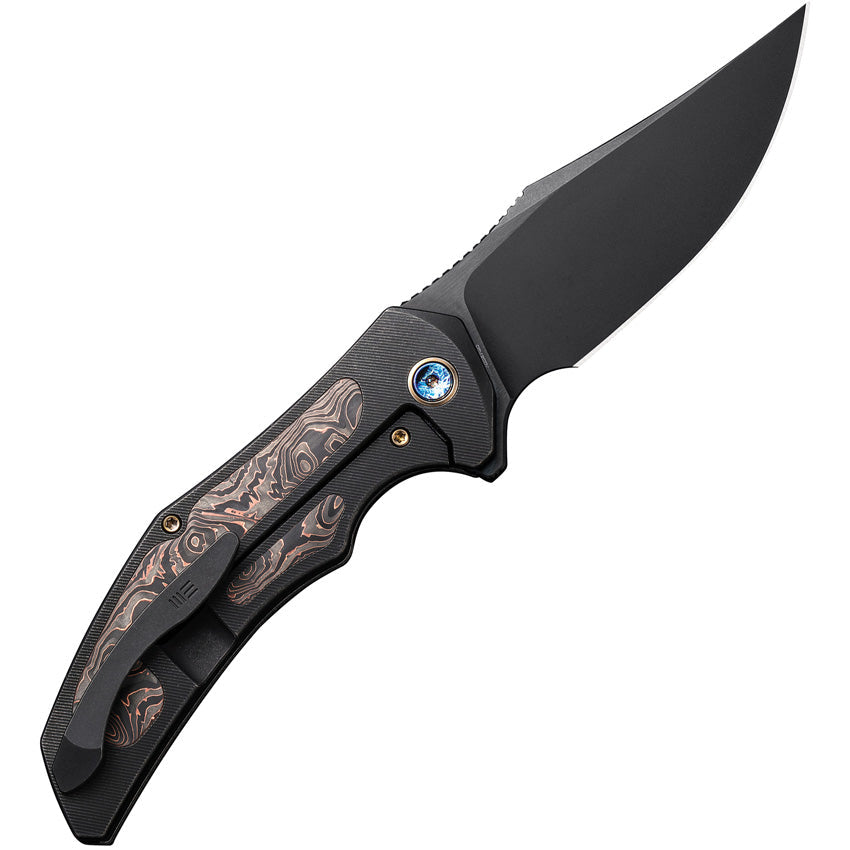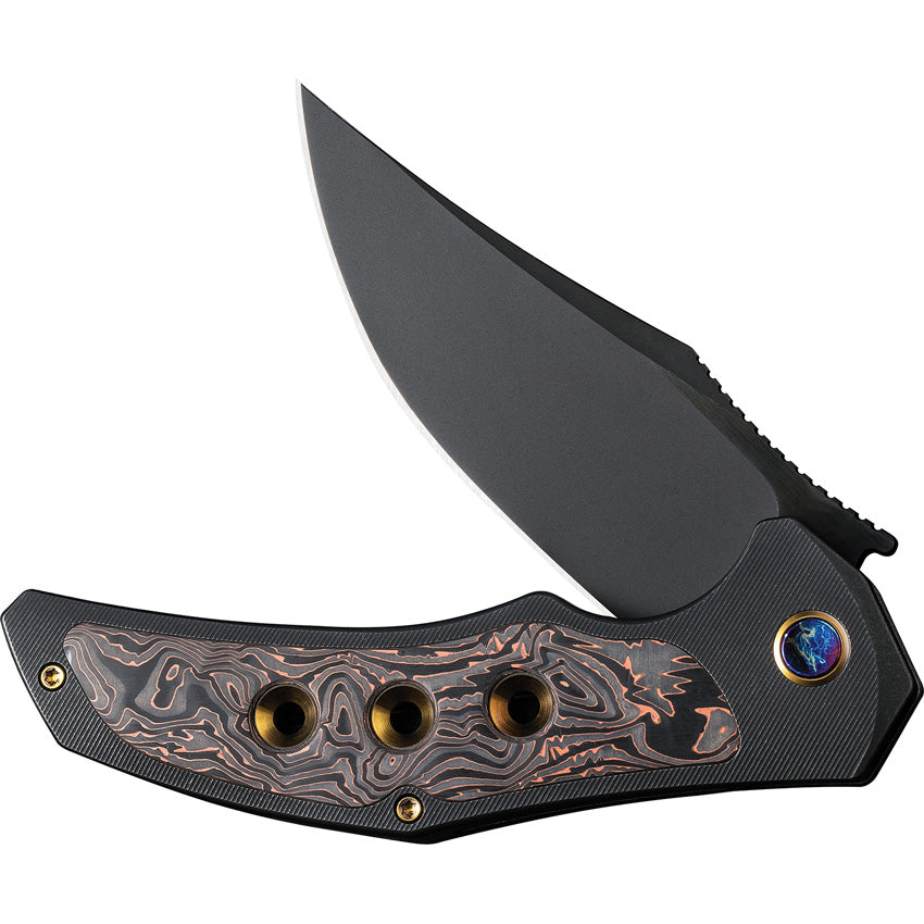 4.75" (12.07cm) closed. 3.75" (9.53cm) black stonewash finish CPM-20CV stainless clip point blade. Black titanium handle with Copper foil carbon fiber inlay. Extended tang. Pocket clip. Black nylon zippered storage case. Boxed.