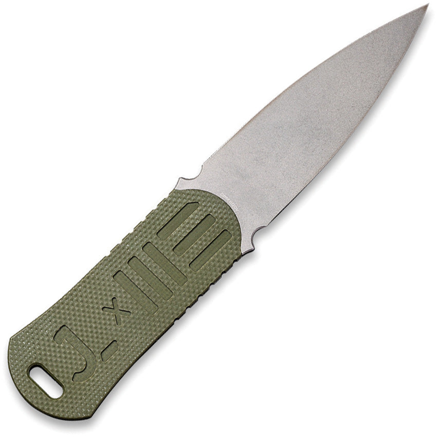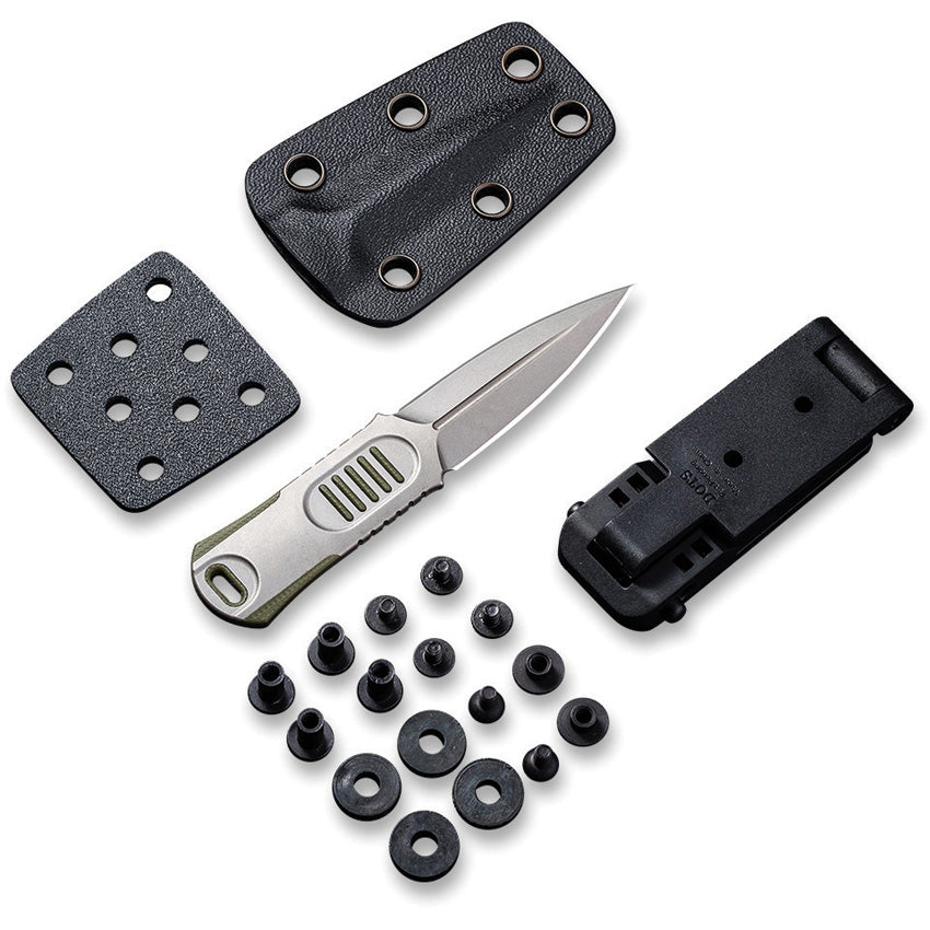 4.25" (10.8cm) 全体。2.25" (5.72cm) ストーンウォッシュ仕上げ CPM-20CV ステンレス短剣刃。グリーン G10 ハンドル。フルタン。ストラップホール。チゼルグラインドブレード。 MOLLEロッククリップ。ブラック カイデックス ベルト シース。箱入り。