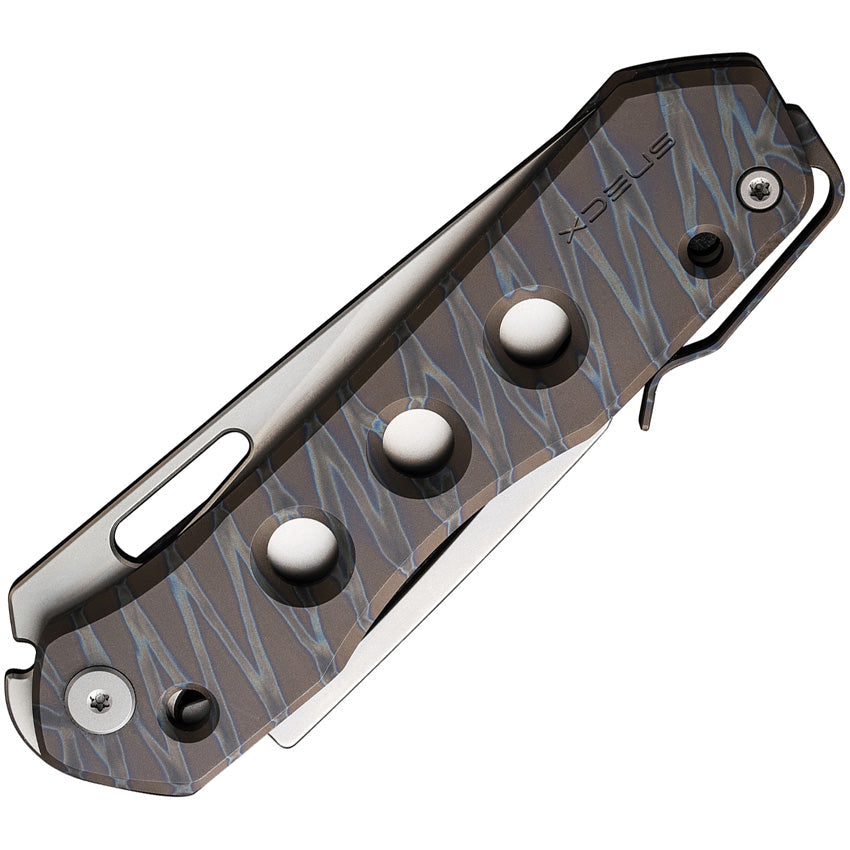 4.5" (11.43cm) closed. 3.5" (8.89cm) bead blast finish CPM-20CV stainless blade. Flame anodized titanium handle. Pocket clip. Thumb pull. Black nylon zippered storage case. Boxed.