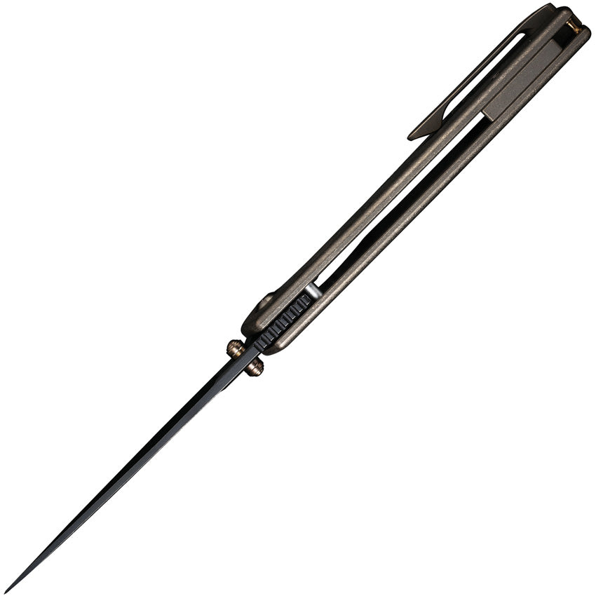 4.5" (11.43cm) closed. 3.5" (8.89cm) black stonewash finish CPM-20CV stainless blade. Bronze stonewash finish titanium handle. Thumb stud. Extended tang. Pocket clip. Black nylon zippered storage case. Boxed.