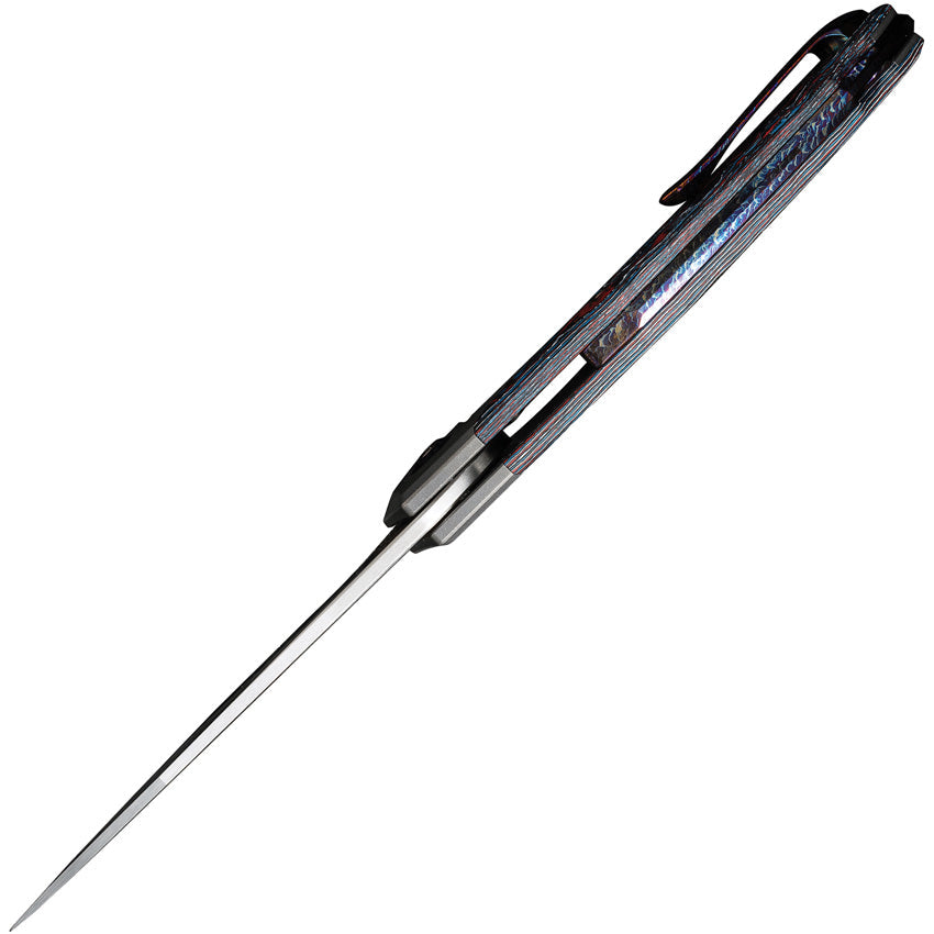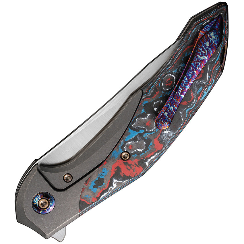 5" (12.7cm) closed. 3.75" (9.53cm) satin finish CPM-20CV stainless trailing point blade. Gray stonewash finish titanium handle with Nebula Fat carbon fiber inlay. Extended tang. Lanyard hole. Pocket clip. Limited edition of 205 pieces. Black nylon zippered storage case.