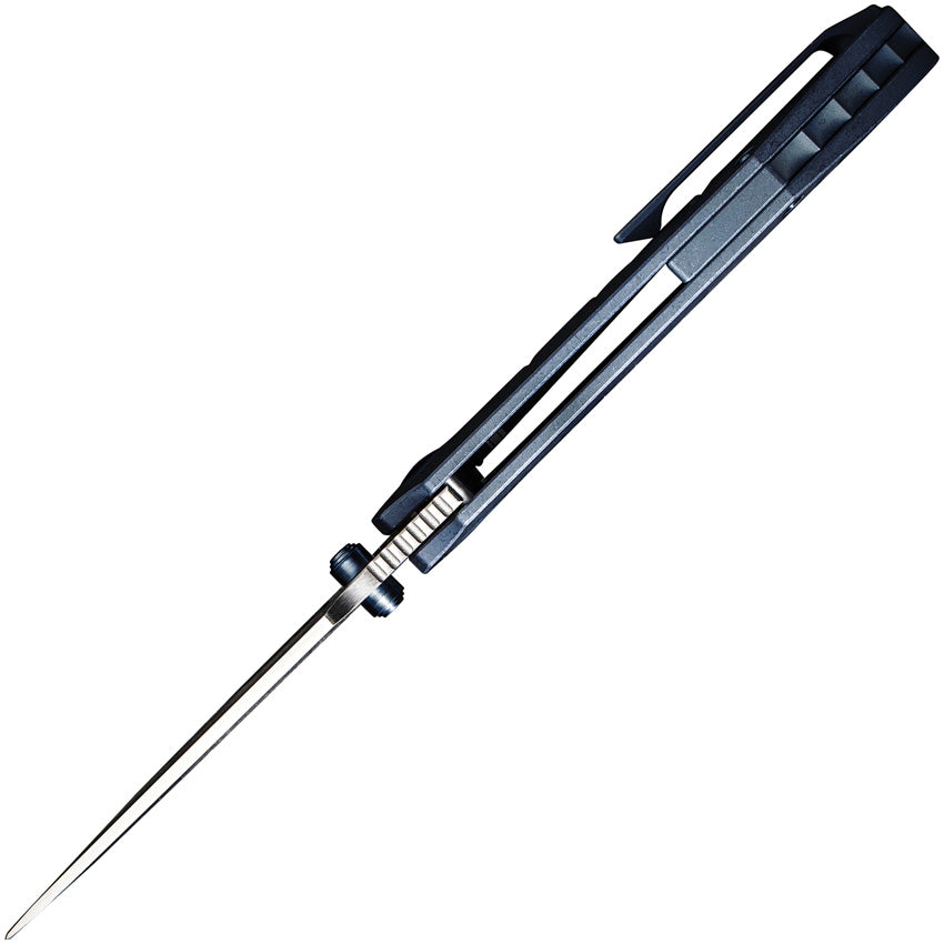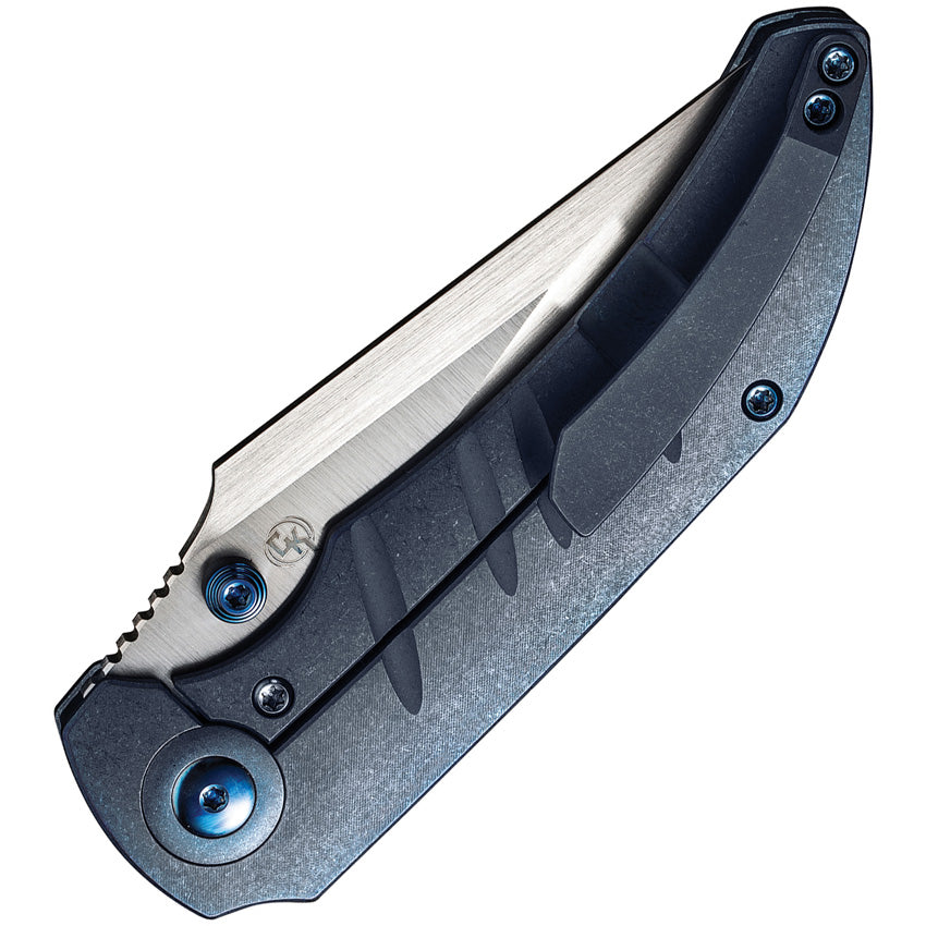4.13" (10.49cm) closed. 3.13" (7.95cm) satin finish CPM-20CV stainless blade. Blue stonewash finish titanium handle. Thumb stud. Pocket clip. Black nylon zippered storage case.