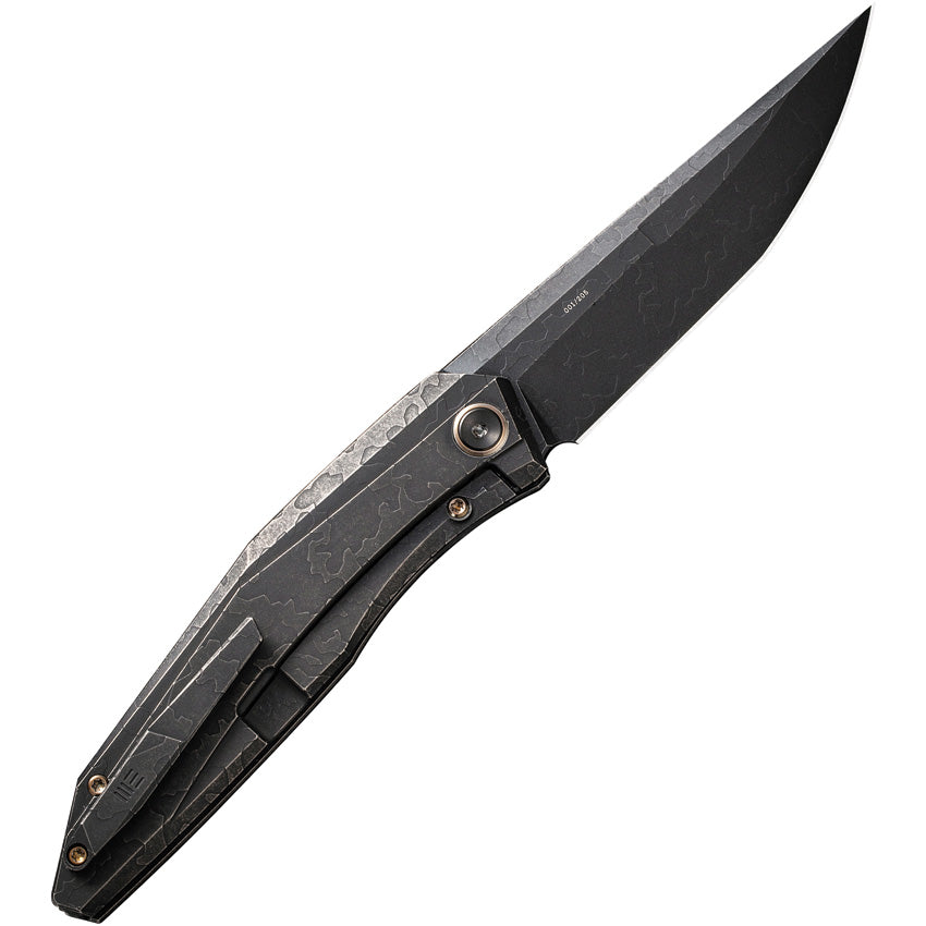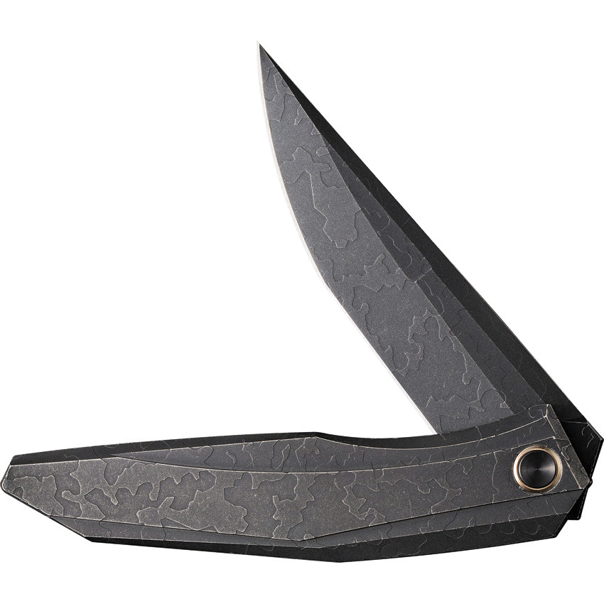 5" (12.7cm) closed. 4" (10.16cm) black stonewash finish CPM-20CV stainless blade. Black stonewash finish titanium handle. Extended tang. Pocket clip. Etched pattern on blade and handle. Black nylon zippered storage case. Boxed.