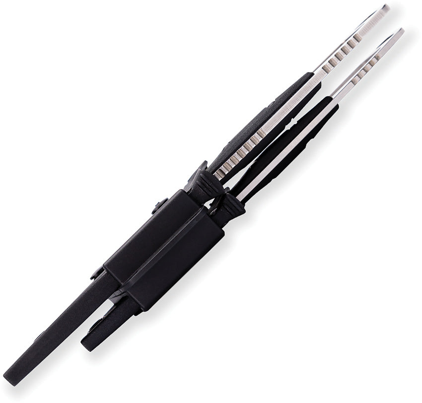 Stonewash finish 420HC stainless blade. Black glass filled nylon handle. Full tang. Lanyard hole. Includes: 8.25" overall skinner with 4" blade; 7.13" overall caping with 3" blade. Black molded plastic belt sheath. Boxed.