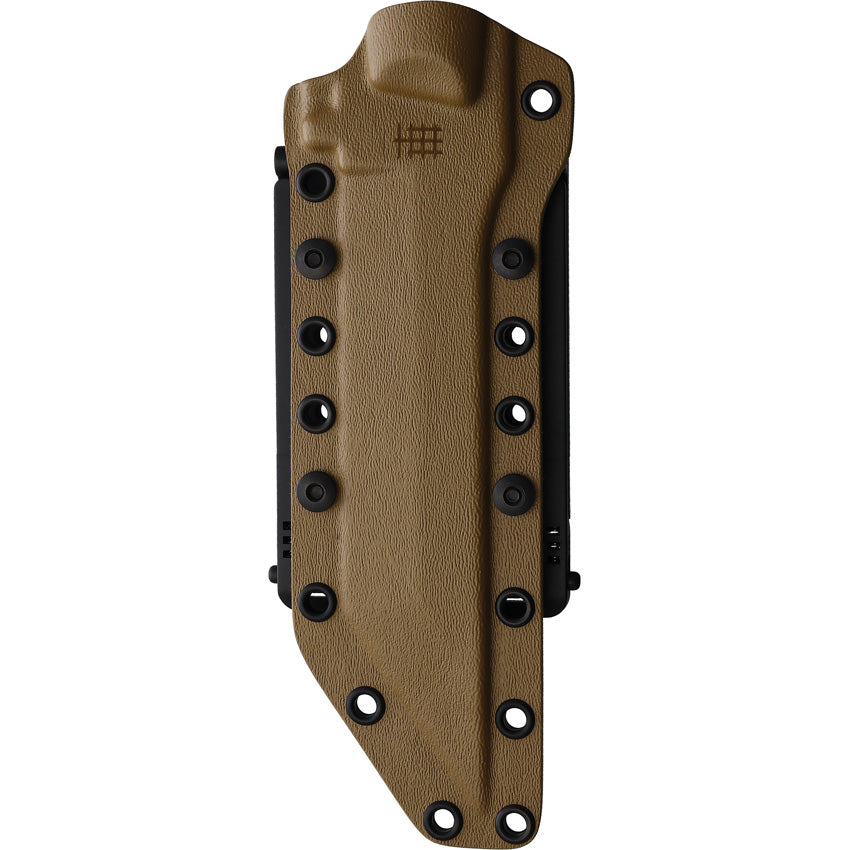 11.75" (29.85cm) overall. 6.75" (17.15cm) dark earth Teflon coated Bohler K110 stainless tanto blade. Dark Earth sculpted G10 handle. Full, extended tang. Lanyard hole. Tan Kydex MOLLE compatible belt sheath.