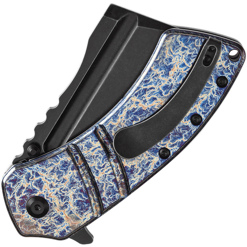 5.25" (13.34cm) closed. 3.5" (8.89cm) black stonewash finish CPM S35VN stainless blade. Lightning strike anodized titanium handle. Extended tang. Thumb stud. Lanyard hole. Pocket clip. Black nylon pouch. Boxed.