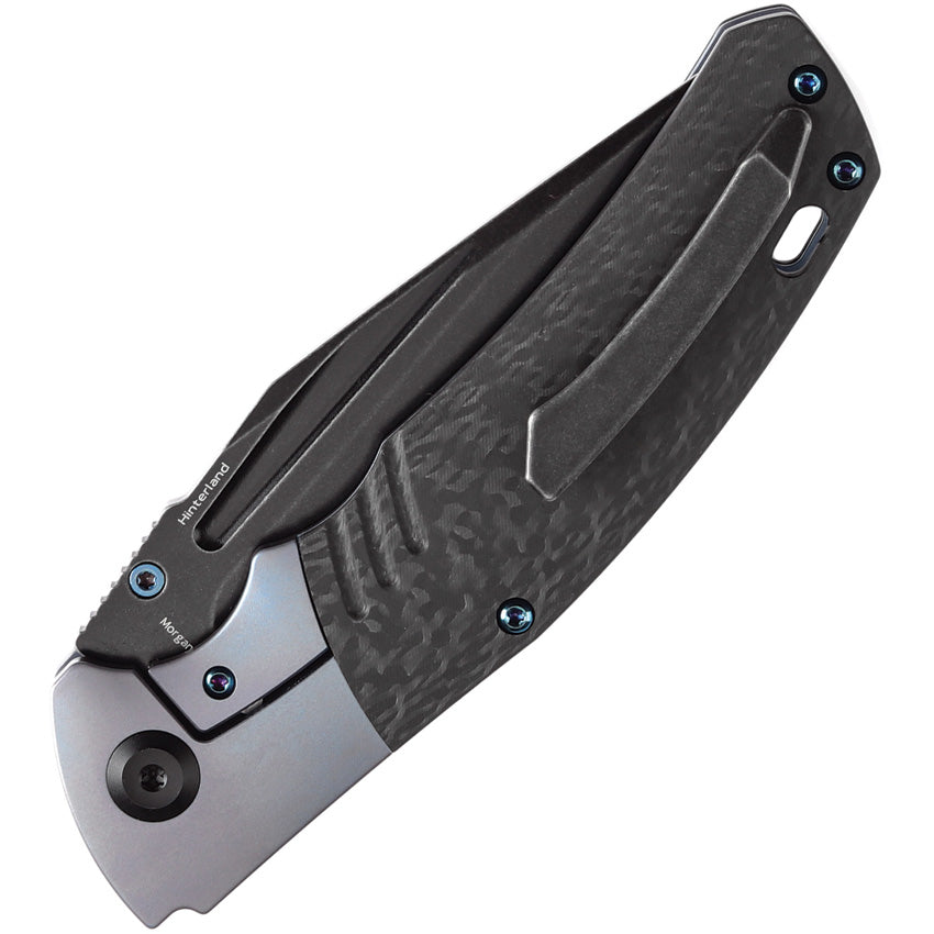 4.63" (11.76cm) closed. 3.63" (9.22cm) black stonewash finish CPM S35VN stainless clip point blade. Blue anodized titanium handle with Twill carbon fiber inlay. Thumb disk. Lanyard hole. Pocket clip. Black nylon pouch.