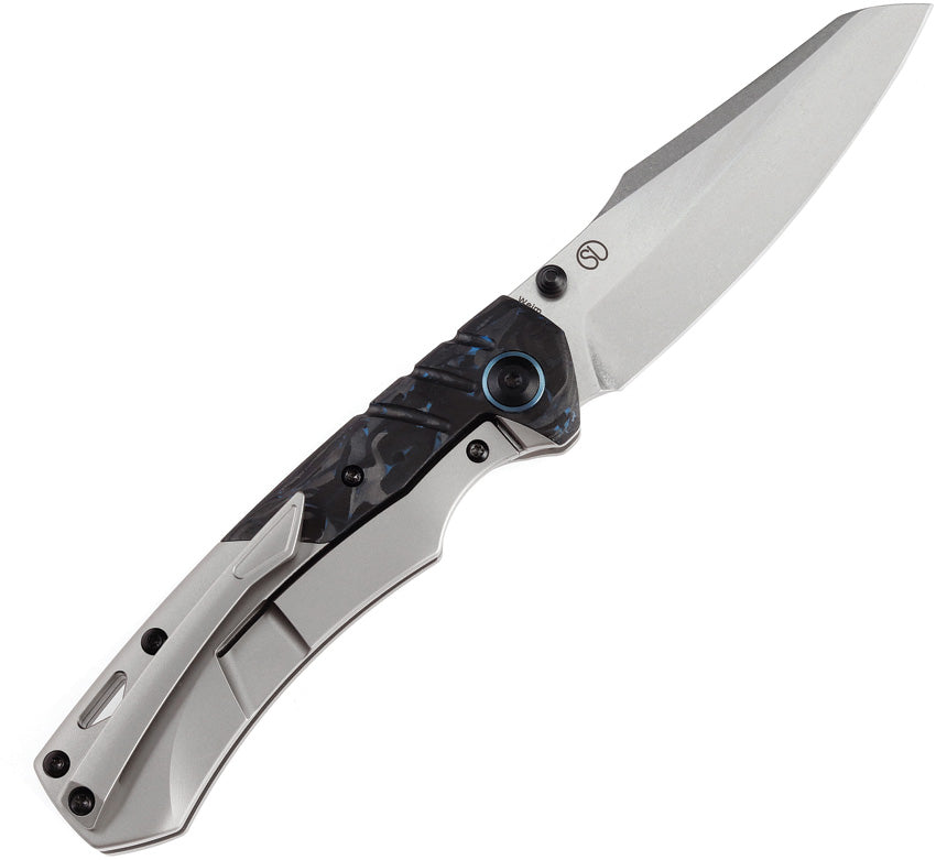4.25" (10.8cm) closed. 3.25" (8.26cm) stonewash finish CPM S35VN stainless sheepsfoot blade. Gray titanium handle with Black and blue carbon fiber inlay. Thumb stud. Lanyard hole. Pocket clip. Black nylon pouch. Boxed.