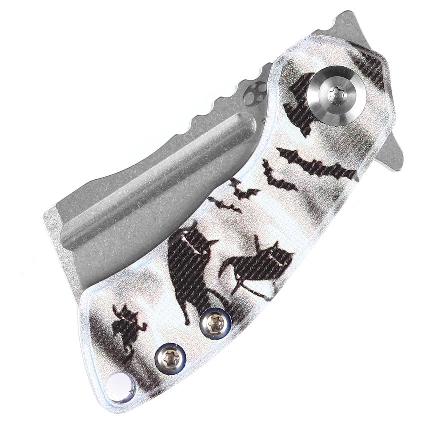 2.25" (5.72cm) closed. 1.5" (3.81cm) stonewash finish 154CM stainless blade. Synthetic handle. Extended tang. Lanyard hole. Pocket clip. Cat and bat print on front handle. Black nylon pouch. Boxed.