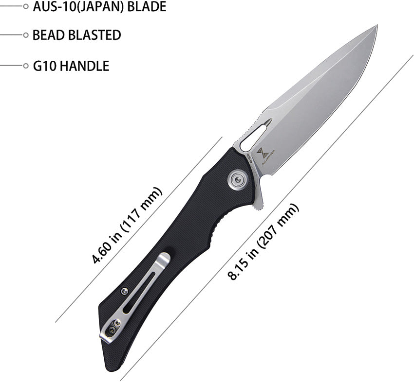 4.75" (12.07cm) closed. 3.88" (9.86cm) sand blast finish AUS-10A stainless blade. Black G10 handle. Extended tang. Thumb pull. Pocket clip. Boxed.