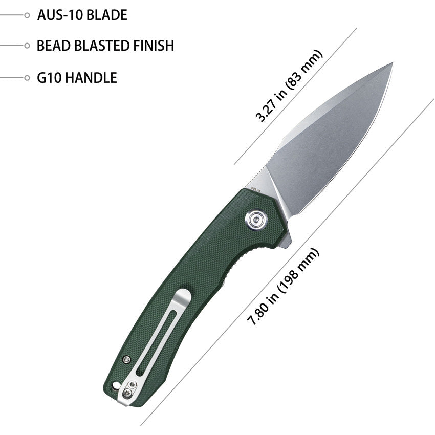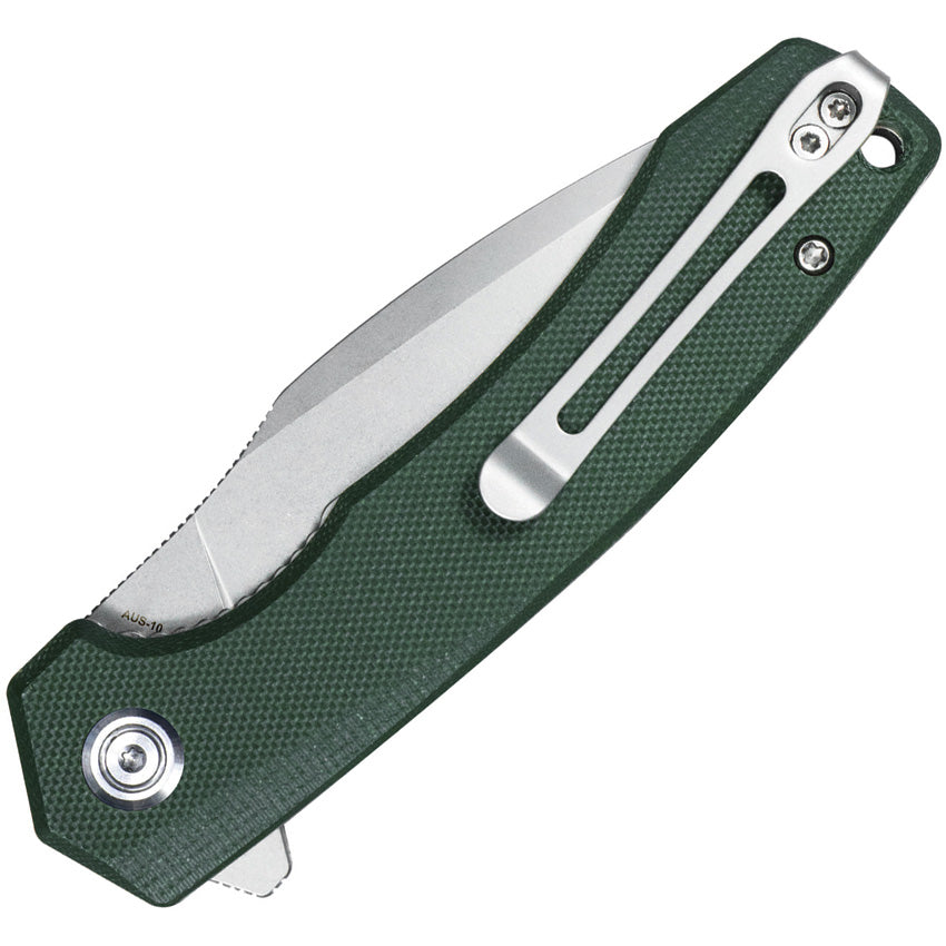 4.5" (11.43cm) closed. 3.5" (8.89cm) satin finish AUS-10A stainless blade. Green G10 handle. Extended tang. Lanyard hole. Pocket clip. Boxed.
